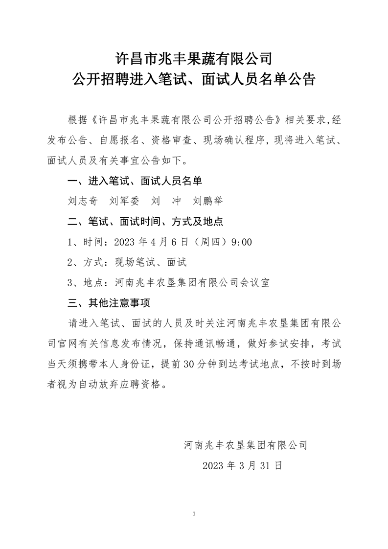 · 許昌市兆豐果蔬有限公司 公開招聘進入筆試、面試人員名單公告