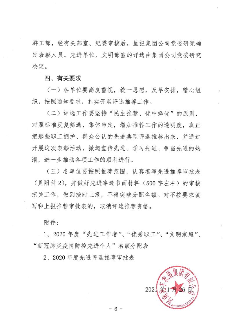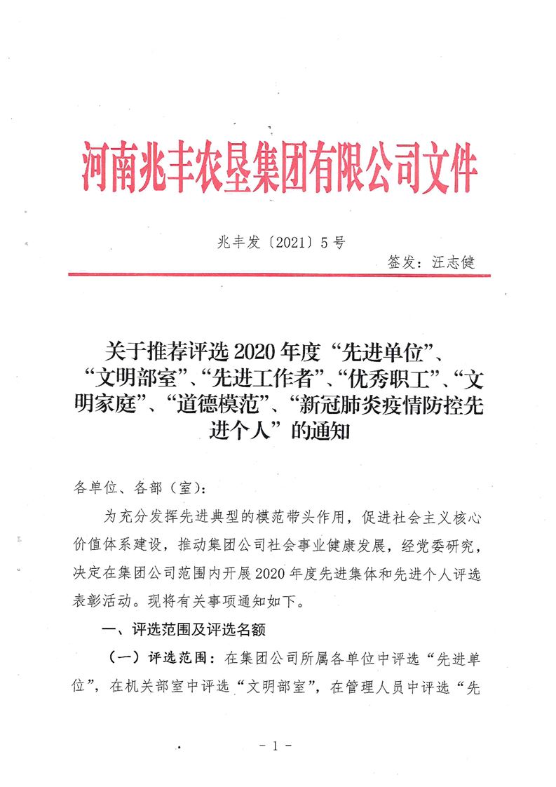 · 河南兆豐農墾集團有限公司 關于推薦2020年度“先進單位”、“文明部室”、“先進工作者”、“優秀職工”、“文明家庭”、“道德模范”、“新冠疫情防控先進個人”的通知