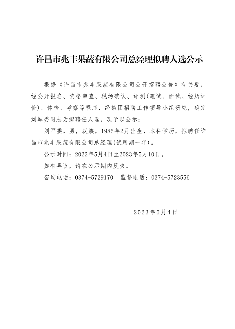 · 許昌市兆豐果蔬有限公司總經理擬聘人選公示