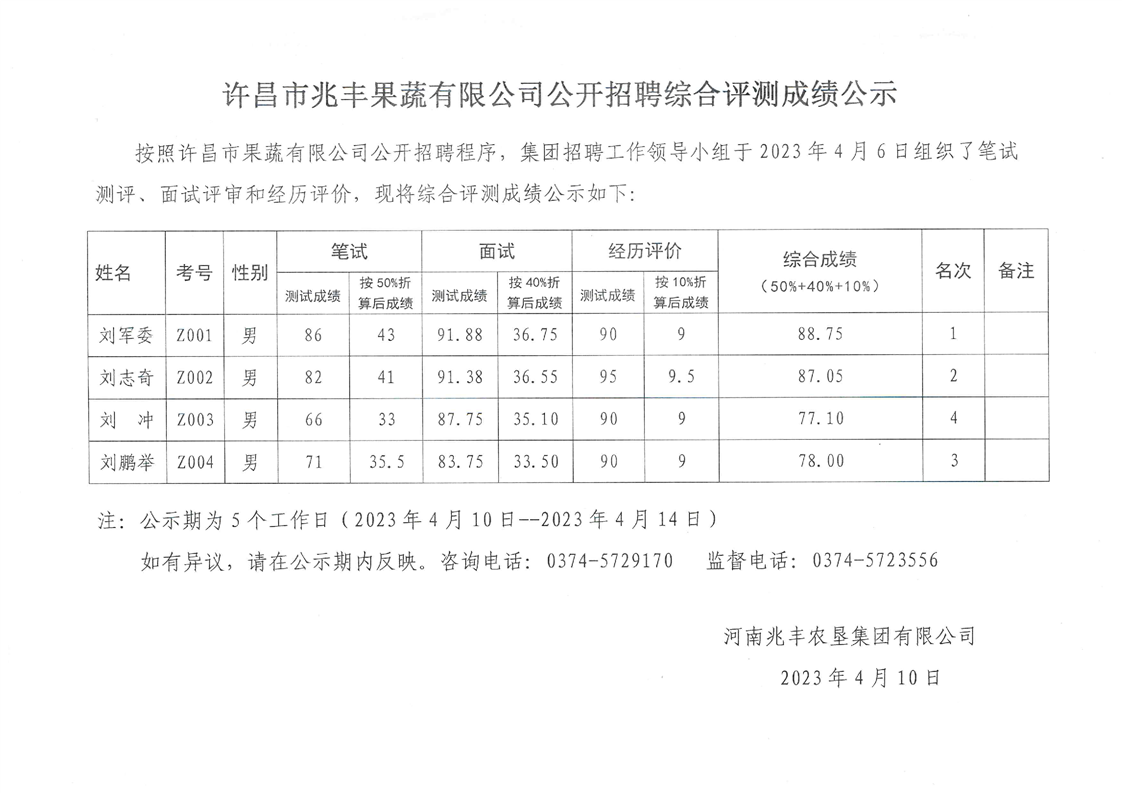· 許昌市兆豐果蔬有限公司公開招聘綜合測評成績公示