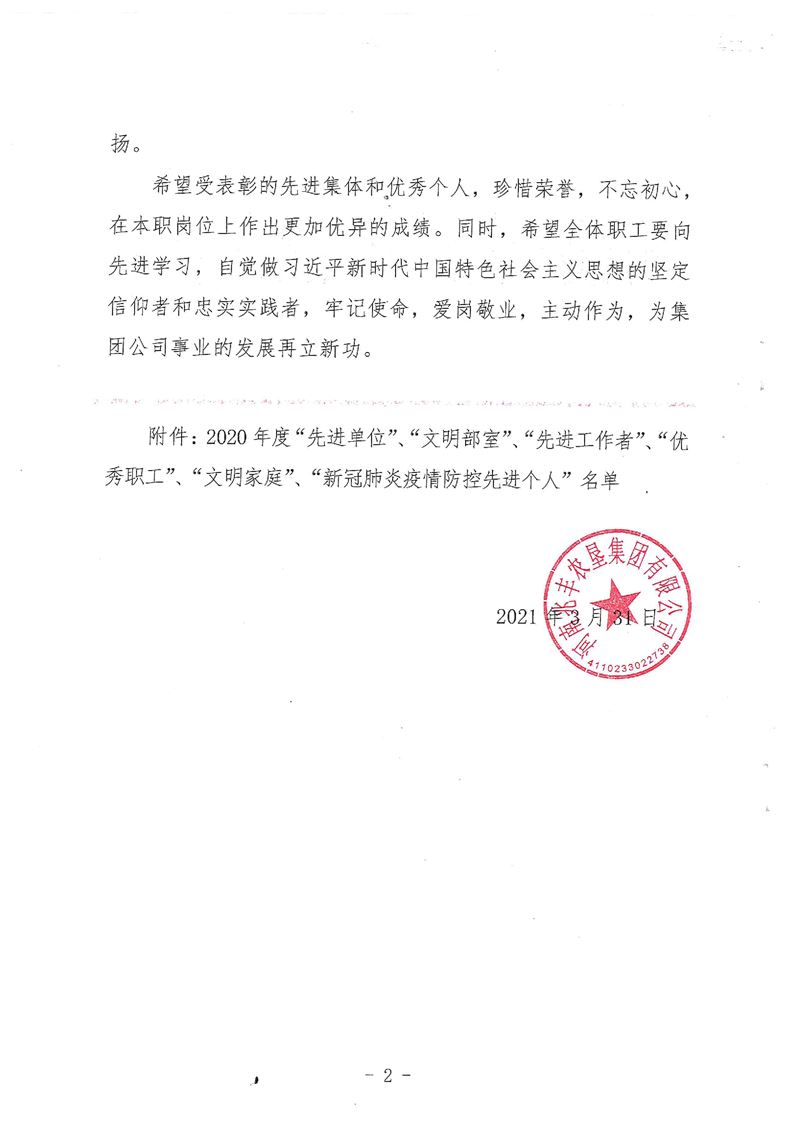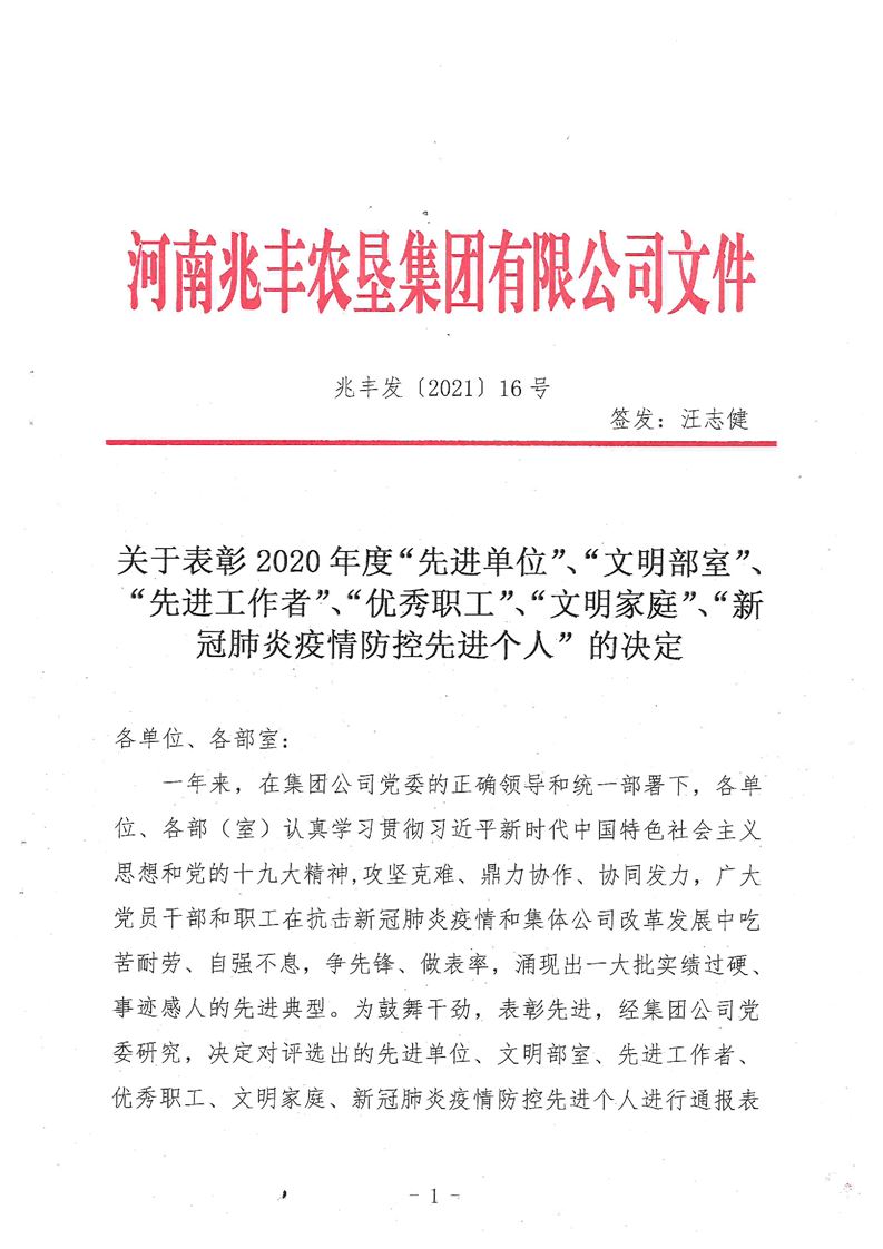 · 河南兆豐農(nóng)墾集團(tuán)有限公司 關(guān)于表彰2020年度“先進(jìn)單位”、文明部室”、“先進(jìn)工作者”、“優(yōu)秀職工”、“文明家庭”、新冠肺炎疫情防控先進(jìn)個人”的決定